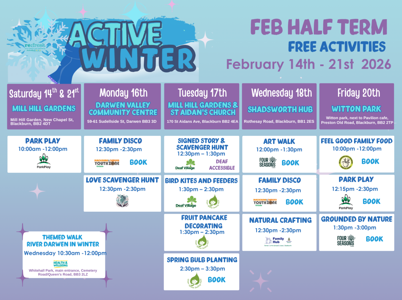 This half term will work similar to our Autumn provision, with each day being dedicated to a specific park in Blackburn & Darwen. Each park will offer a range of different activities suitable for families of all ages!