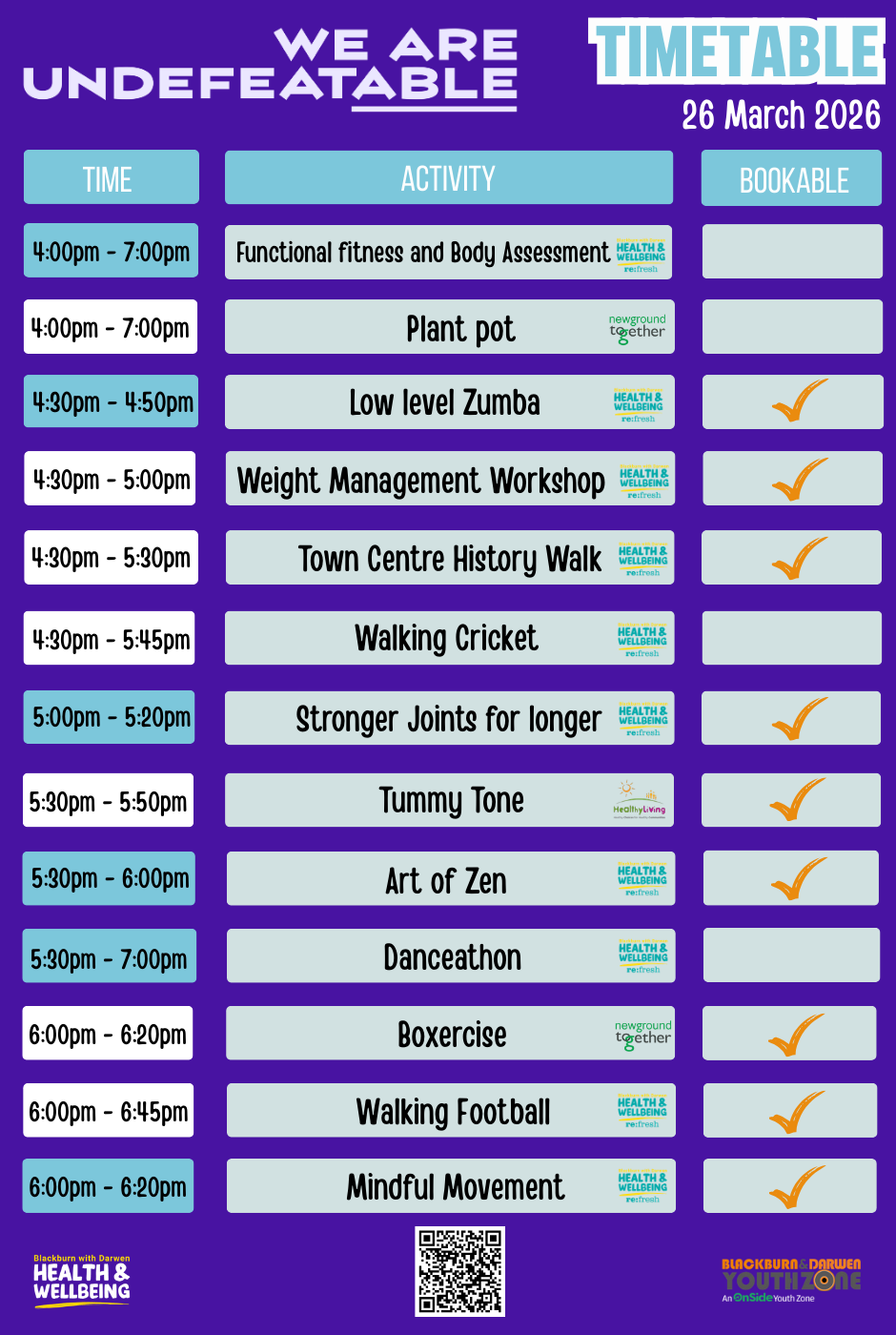 The event is free to attend and you can drop in anytime between 4pm and 7pm. Some taster sessions will require booking due to limited spaces, and the 1-1 health coaching sessions and full NHS health checks will require booking also. Full details and booking links will be shared once the taster session timetable goes live.